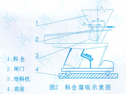 (3)料倉開口尺寸應能保證獲得足夠的料層厚度。同時為了調節(jié)料層厚度應設置閘門。料倉配置型式參看圖2,一般情況下,a與b的比值為1/4左右。