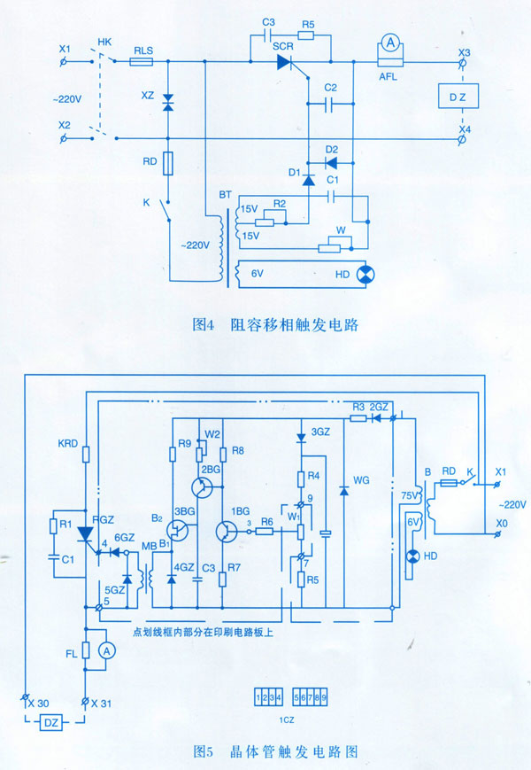 圖4所示為阻容移相角撥電路原理圖,圖5所示為晶體管觸發(fā)電路原理。其它如需各種 形式的自動控制電控箱,可按要求制作。七、隨機技術文件